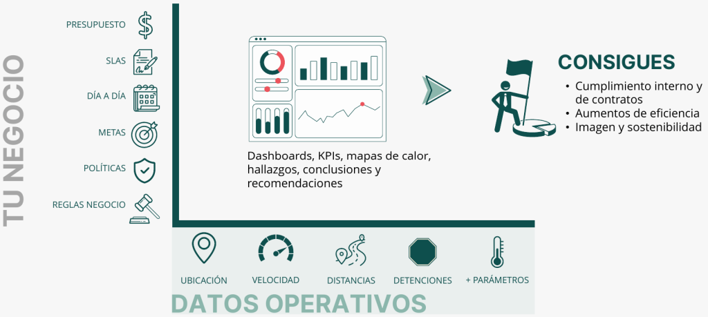 Cruzamos los datos de tus vehículos (ubicación, velocidad, etc.) con tu negocio → eficiencia y cumplimiento
